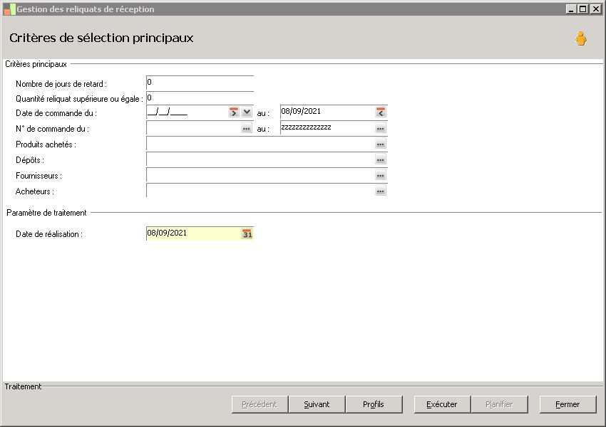 Nombre de jours de retard permet de sélectionner les produits dont le retard de réception par rapport à la date de génération prévue est égale ou supérieure à la valeur saisie. Si elle est laissée égale à zéro, le programme ne se basera que sur la date de génération pour sélectionner les lignes en retard de réception.