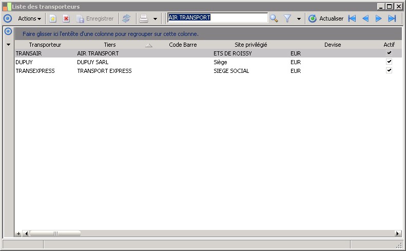 Cette fenêtre affiche la liste des tiers dont on a coché l'option Transporteur dans le volet Général de leur fiche. Elle est ouverte par la fonction Fichiers de base / Transporteurs / Transporteurs .