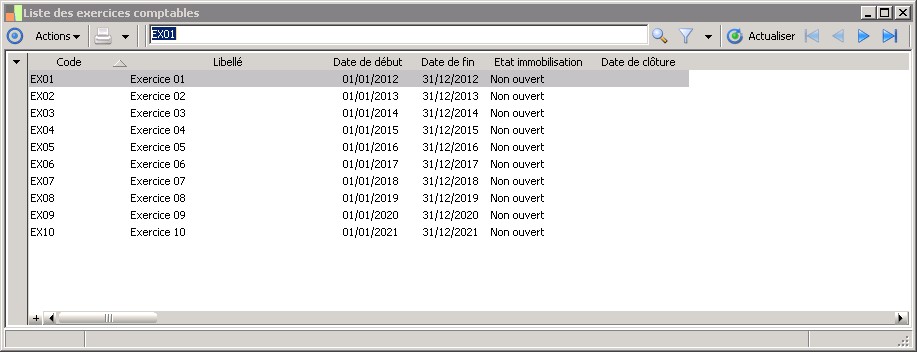 Le code identifie l'exercice de façon unique.Les exercices utilisent les périodes de la dimension temps préalablement créée.On peut avoir autant d'exercices que nécessaire, dans la limite de la dimension temps.