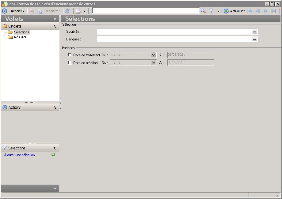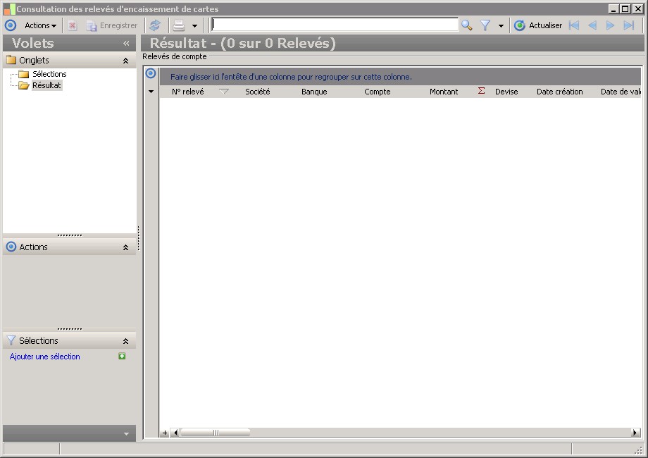 (Sage FRP 1000 Suite Financière) Menu Banque Paiement > Relevés et Notifications > Relevés d'encaissement de cartes > Consultation des relevés d'encaissement de cartes