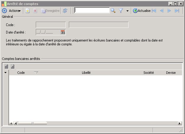 (Sage FRP 1000 Suite Financière) Menu Comptabilité > Générale > Rapprochement > Arrêté de comptes