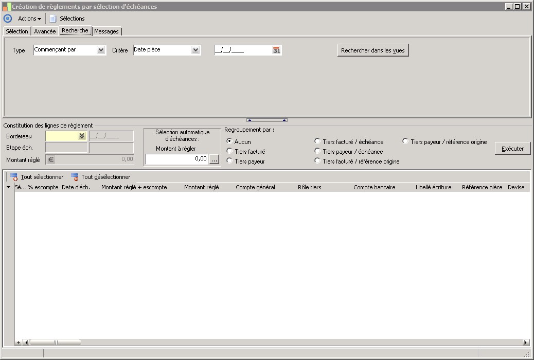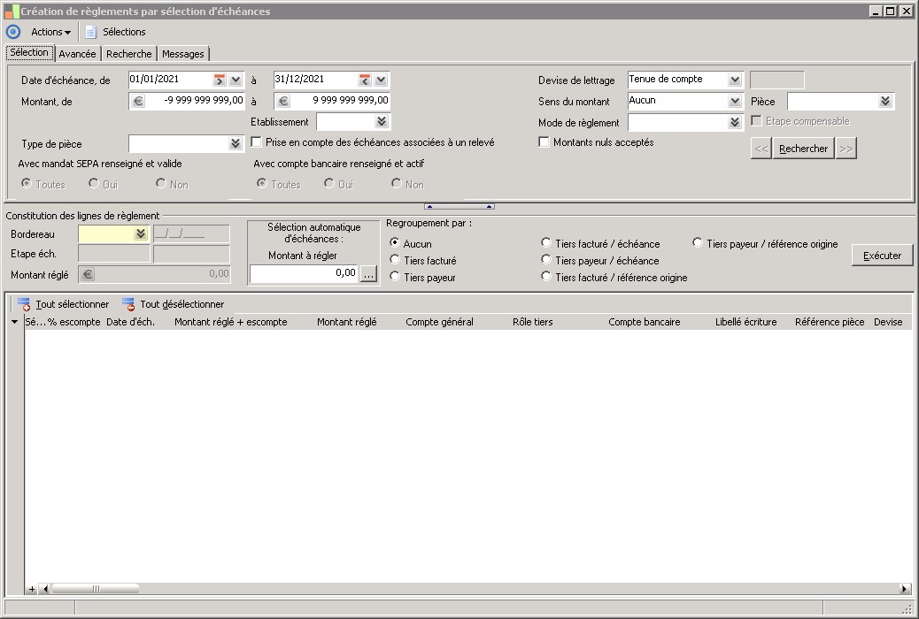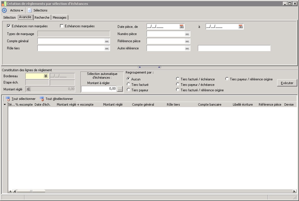 Il est possible de sélectionner les échéances à règler par rapport à la référence de la pièce associée aux échéances. |