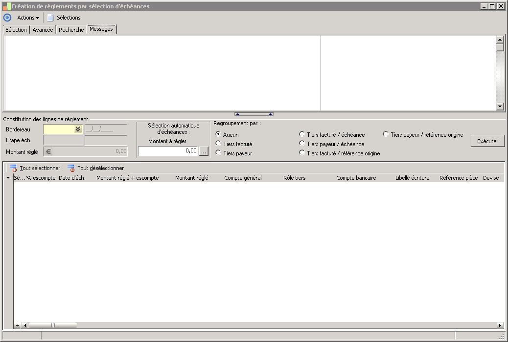 Cet attribut permet de sélectionner le mode de regroupement des échéances sélectionnées :- Aucun : les échéances ne sont pas regroupées. Un règlement est généré par échéance sélectionnée à condition que le sens de l'échéance soit cohérent avec le type de règlement de l'étape du bordereau (échéance au débit pour un encaissement et échéance au crédit pour un décaissement)- Facturé : les échéances sont regroupées par role tiers facturé : un seul règlement est généré par role tiers facturé pour le solde des échéances sélectionnées à condition que le sens de ce solde soit cohérent avec le type de règlement de l'étape du bordereau (solde au débit pour un encaissement et solde au crédit pour un décaissement).- Payeur : les échéances sont regroupées par rôle tiers payeur ou à payer : un seul règlement est généré par role tiers payeur ou à payer pour le solde des échéances sélectionnées à condition que le sens de ce solde soit cohérent avec le type de règlement de l'étape du bordereau (solde au débit pour un encaissement et solde au crédit pour un décaissement). |
