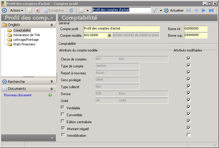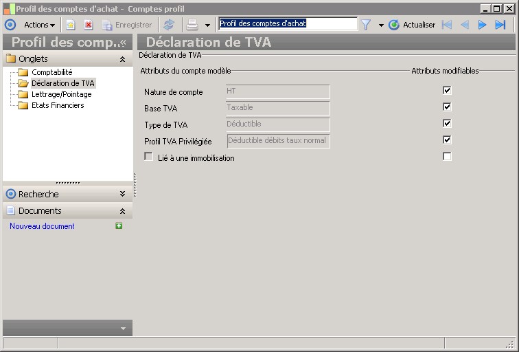 L'attribut nature de compte précise les relations entre le compte général et la TVA lorsque ce compte est lié à la gestion de la TVA. On a le choix entre plusieurs natures:- TTC : cette nature s'applique plus particulièrement aux comptes collectifs (par ex. : clients, fournisseurs)- HT : cette nature s'applique aux comptes de bilan ou de gestion (immobilisations, classe 6 et 7) -TVA : cette nature s'applique aux comptes enregistrant la TVA.- Autre : pour tous les comptes ne permettant pas de gérer la TVA.Si la nature du compte est HT, il faut obligatoirement indiquer un ou plusieurs profils de TVA (dont un déclaré privilégié). Dans le contexte de la comptabilité, ce profil de TVA permettra le calcul et la comptabilisation automatique de la TVA en saisie. |