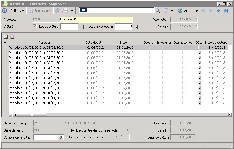 Le code identifie l'exercice de façon unique.Les exercices utilisent les périodes de la dimension temps préalablement créée.On peut avoir autant d'exercices que nécessaire, dans la limite de la dimension temps. |
