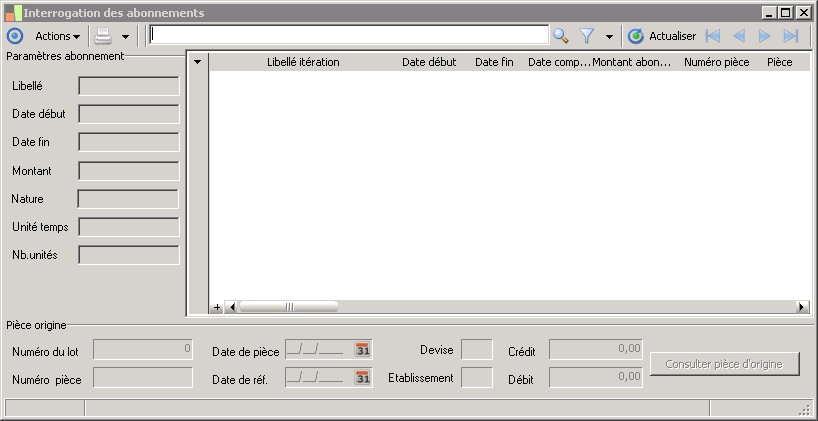 (Sage FRP 1000 Suite Financière) Menu Comptabilité > Générale > Abonnements > Interrogation des abonnements