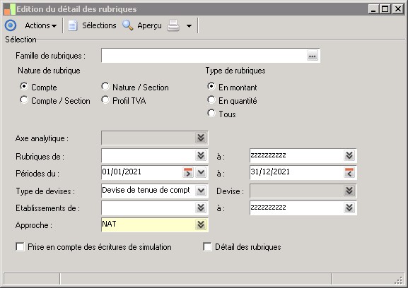 (Sage FRP 1000 Suite Financière) Menu Comptabilité > Générale > Editions comptables > Edition du détail des rubriques