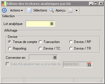 Cet élément n'est accessible que lorsqu'un choix Devise/TC, Devise/RP, ou Devise/TR a été coché dans le cadre "En devise de". On indique ici la devise d'affichage qui servira de base pour convertir les montants enregistrés en devise de Tenue de Compte, de Reporting ou de Transaction. |