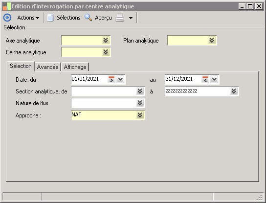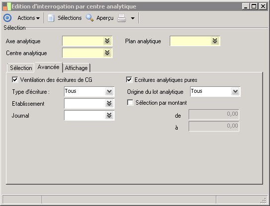 (Sage FRP 1000 Suite Financière) Menu Comptabilité > Analytique > Interrogations / Consultations > Edition d'interrogation par centre analytique