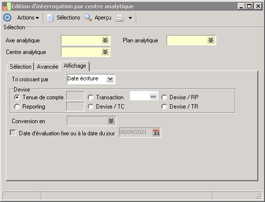 Ce critère permet de sélectionner une devise de transaction : seules les écritures analytiques dans cette devise sont affichées.