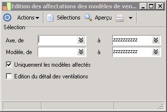 (Sage FRP 1000 Suite Financière) Menu Comptabilité > Fichiers de base > Ventilations analytiques > Edition des affectations des modèles de ventilation par axe