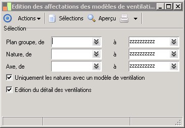 (Sage FRP 1000 Suite Financière) Menu Comptabilité > Fichiers de base > Ventilations analytiques > Edition des affectations des modèles de ventilation par nature