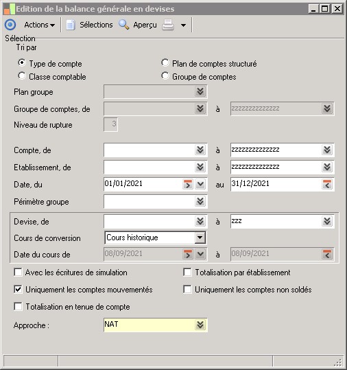 (Sage FRP 1000 Suite Financière) Menu Comptabilité > Générale > Editions comptables > Edition de la balance générale en devises