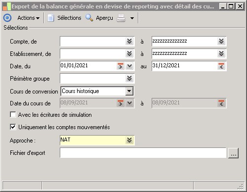 (Sage FRP 1000 Suite Financière) Menu Comptabilité > Initialisation > Import / export de tables > Export de la balance générale en devise de reporting avec détail des cumuls/période