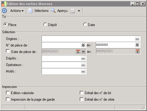 (Sage FRP 1000 Suite Financière) Menu Processus Opérationnels > Stocks > Opérations diverses > Edition des sorties diverses