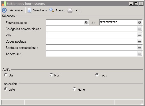 (Sage FRP 1000 Suite Financière) Menu Processus Opérationnels > Fichiers de base > Fournisseurs > Edition des fournisseurs