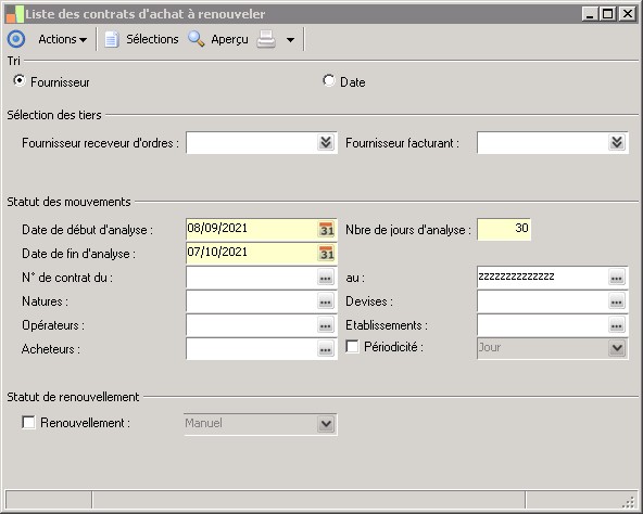 Cette fonction permet, à partir de nombreux critères de sélection, d'imprimer les contrats d'achat classés par fournisseur, numéro de contrat, type de renouvellement?