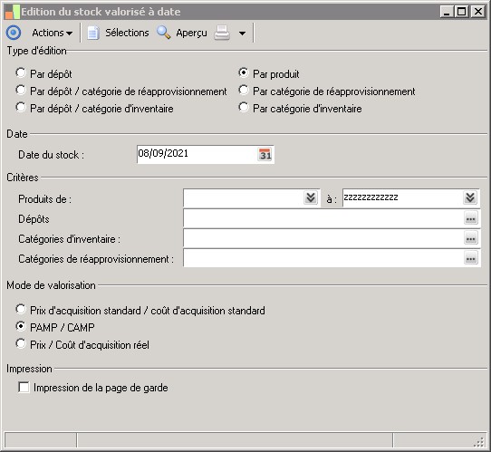 Cette fonction permet d'éditer un état donnant, pour un ou plusieurs produits donnés, la valorisation du stock au PAMP-CAMP) ou aux prix d'achat ou coût d'achat standards (ces deux montants apparaissent dans le sous-volet Coût d'achat de la fiche produit).