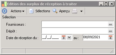 Cette fonction permet d'imprimer la liste des produits reçus des fournisseurs comme surplus de réception. Elle est lancée à partir de la fonction Achats / Réception / Éditions / Surplus de réception à traiter .