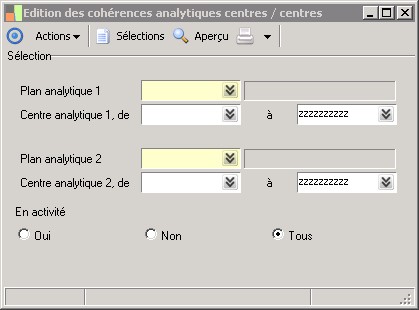 (Sage FRP 1000 Suite Financière) Menu Comptabilité > Paramètres > Comptabilité analytique > Edition des cohérences analytiques centres / centres