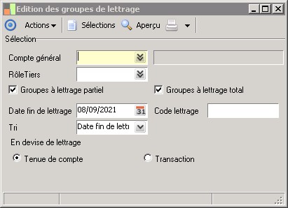 Cette zone permet de rechercher les groupes de lettrage dont le lettrage est total ; c'est à dire dont toutes les échéances sont totalement lettrées.