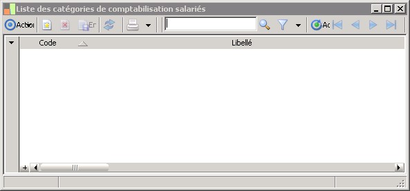 Cette fenêtre autorise la création, la consultation, la modification et la suppression des catégories de comptabilisation salariés.