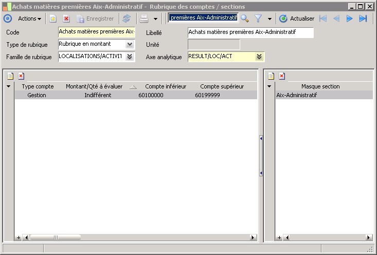 Pour une rubrique de comptes sections, les montants à évaluer sont les mêmes que pour les rubriques de comptes avec en plus :- Montant reçu : permet de considérer les montants reçus au niveau de chaque couple compte / section de la tranche..- Montant déversé : permet de considérer les montants déversés au niveau de chaque couple compte / section de la tranche.- Solde reçu : permet de considérer uniquement les soldes reçus pour les couples comptes sections compris dans la tranche.- Solde déversé : permet de considérer uniquement les soldes déversés pour les couples comptes sections compris dans la tranche. |