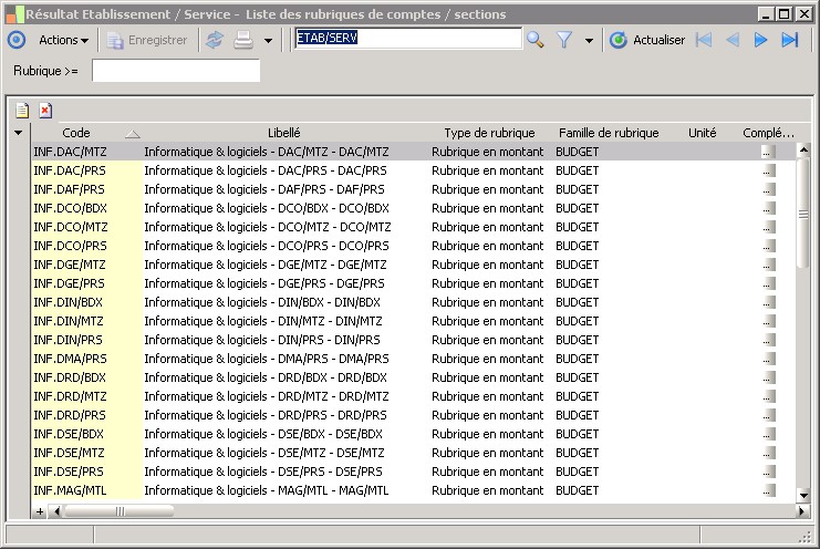 Cette fonction présente la liste des rubriques de comptes généraux par sections créées. Rappelons qu'elles permettent de regrouper des montants ou des quantités enregistrées sur les "couples" comptes généraux/sections.