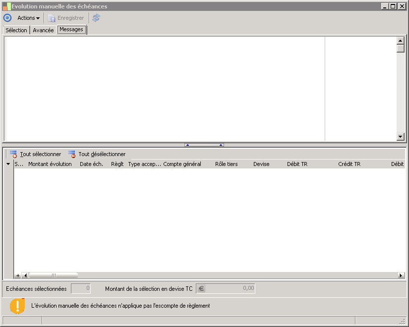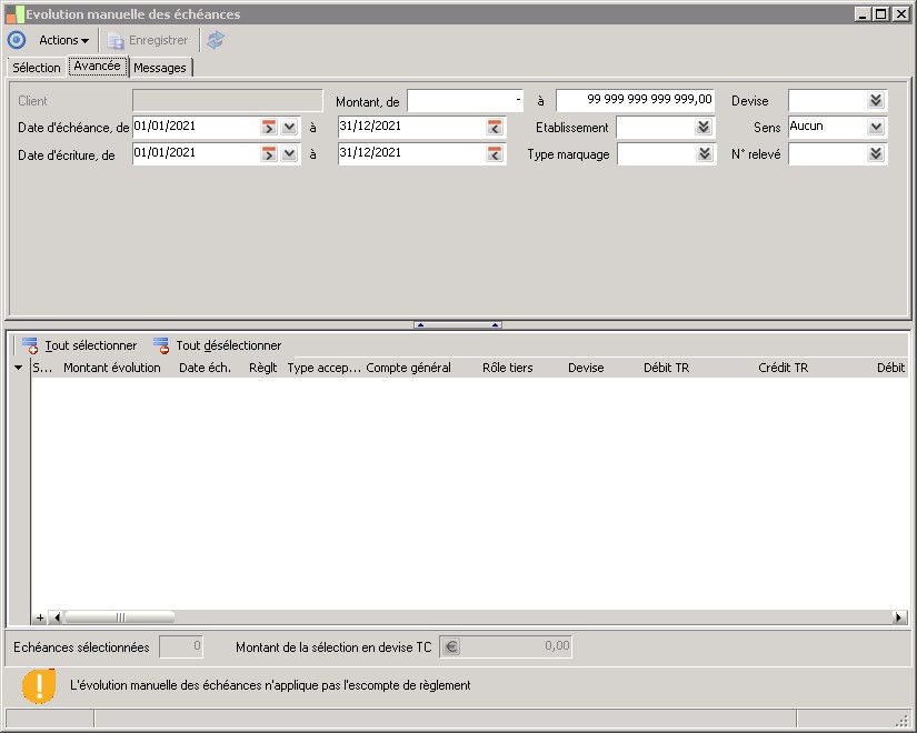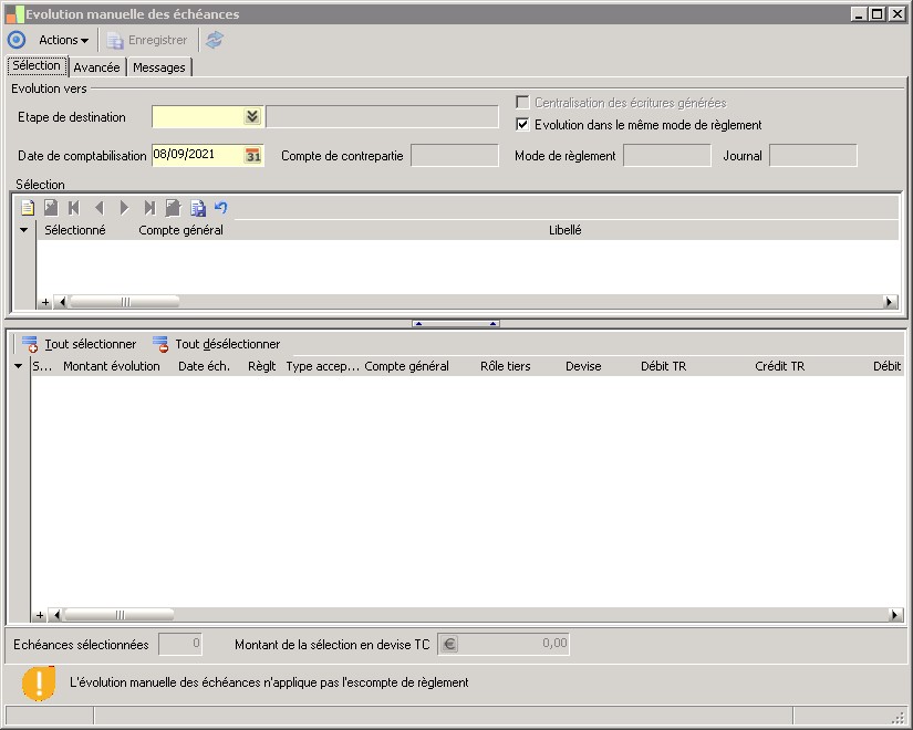 (Sage FRP 1000 Suite Financière) Menu Comptabilité > Echéancier > Evolution d'échéances > Evolution manuelle des échéances