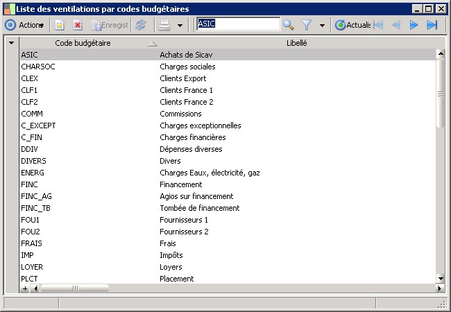 (Sage FRP 1000 Trésorerie) Menu Budget > Paramètres > Liste des ventilations par codes budgétaires