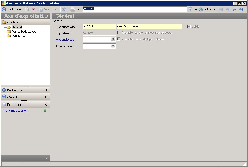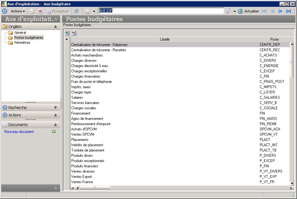 L'association d'un poste budgétaire à un axe peut également se réaliser dans l'écran de paramétrage des postes budgétaires. |
