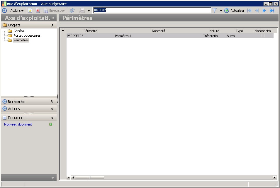 (Sage FRP 1000 Trésorerie) Menu Trésorerie > Paramètres > Sociétés > Axe budgétaire