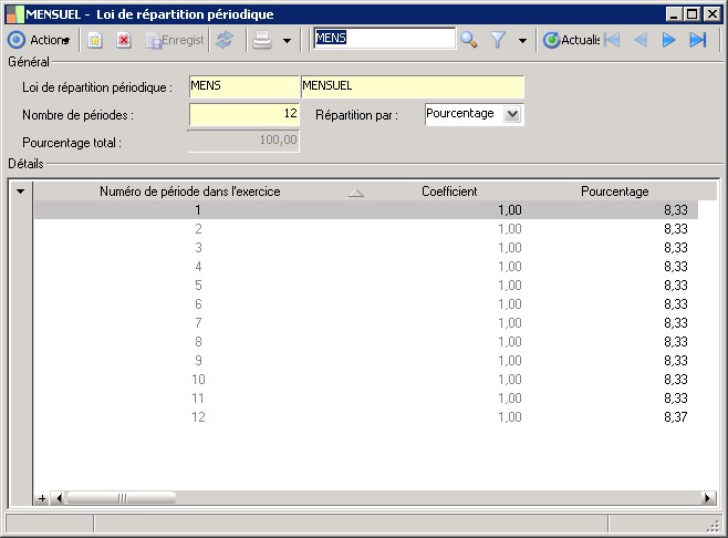 (Sage FRP 1000 Trésorerie) Menu Budget > Paramètres > Loi de répartition périodique
