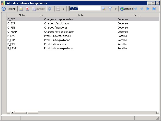 Cet écran vous présente la liste des natures budgétaires, en précisant pour chacune leur code, leur libellé et leur sens.
