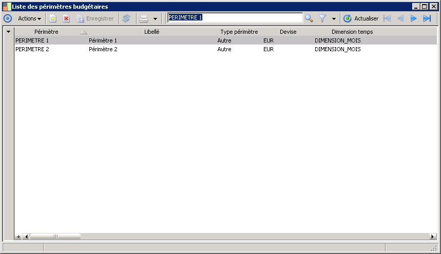(Sage FRP 1000 Trésorerie) Menu Budget > Initialisation > Liste des périmètres budgétaires