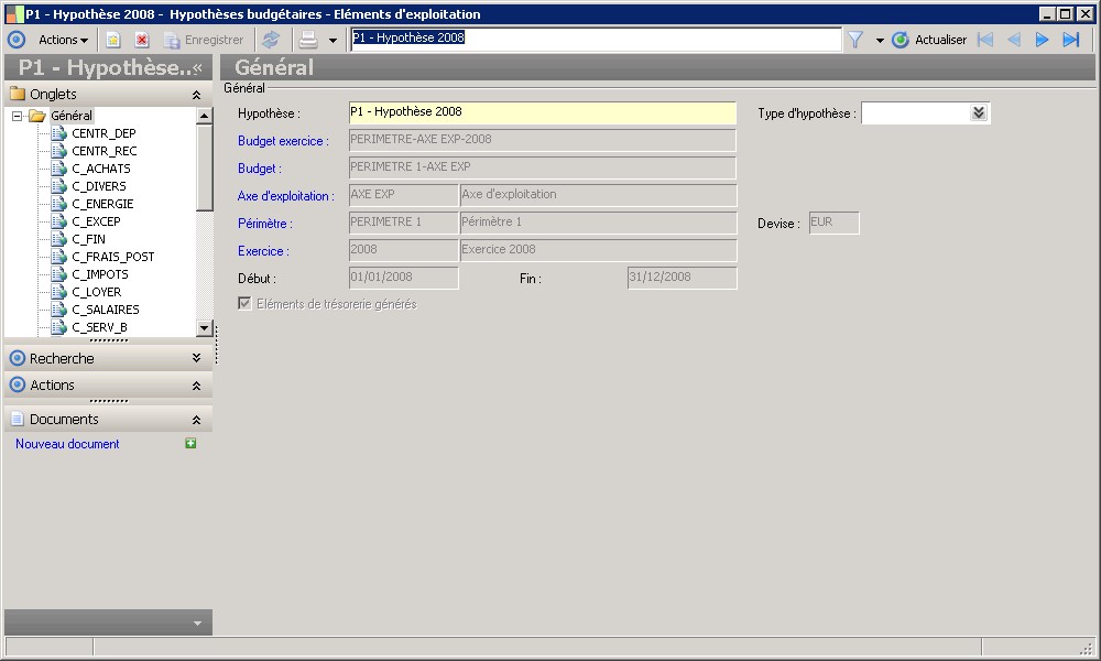 (Sage FRP 1000 Trésorerie) Menu Budget > Hypothèses > Hypothèses budgétaires - Eléments d'exploitation