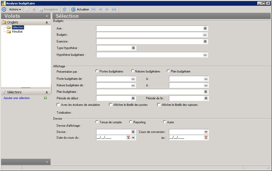 Indiquez dans le dossier Sélection l'hypothèse que vous souhaitez analyser, le mode d'affichage (liste des postes, des naturesou affichage par plan budgétaire), ainsi que la devise d'affichage à que vous souhaitez utiliser.
