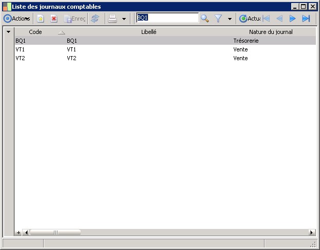 (Sage FRP 1000 Trésorerie) Menu Banque Paiement > Paramètres > Comptabilisation > Liste des journaux comptables