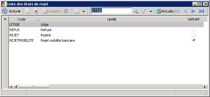 (Sage FRP 1000 Trésorerie) Menu Banque Paiement > Paramètres > Paramètres > Liste des états de rejet