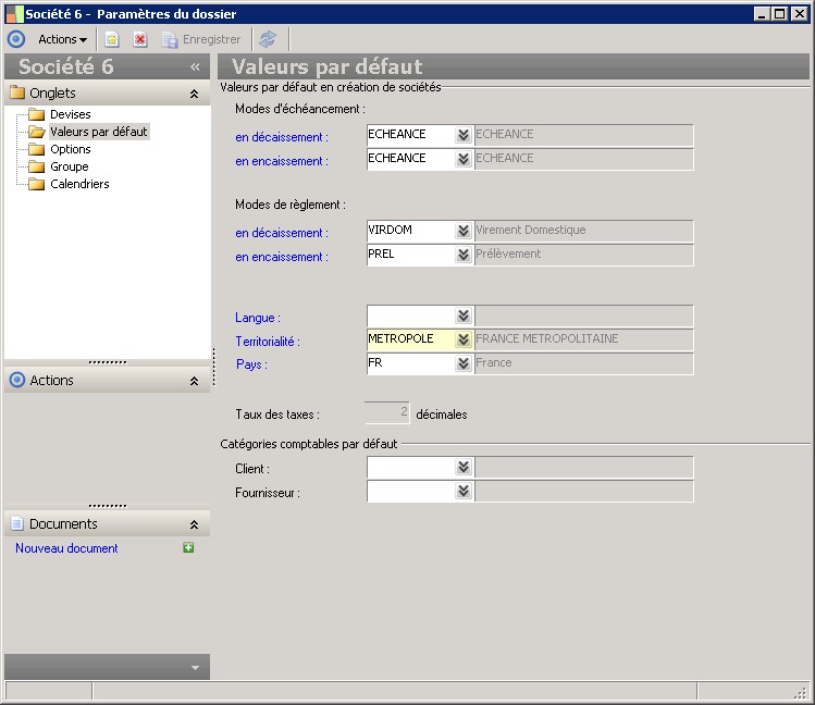 Cette zone indique la territorialité de la société vis-à-vis du calcul des taxes : Elle sert à déterminer le régime de TVA en pièce commerciale (en combinaison avec la territorialité liée à l'adresse du tiers concerné par la pièce). |
