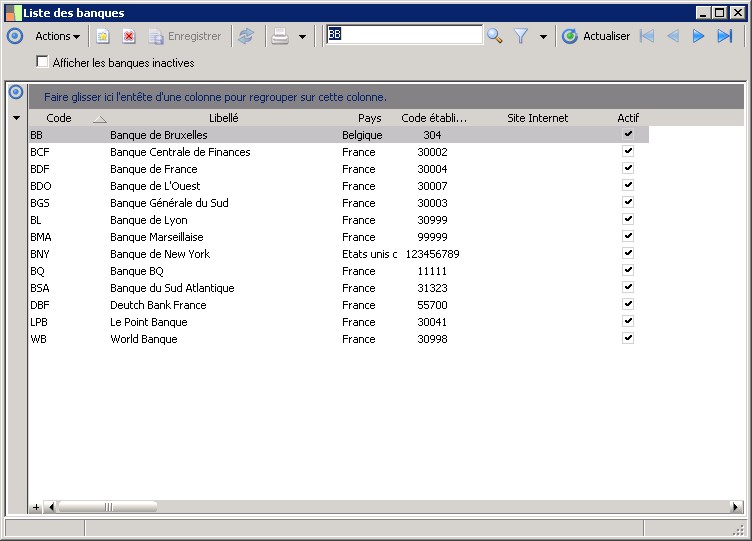 (Sage FRP 1000 Trésorerie) Menu Trésorerie > Paramètres > Banques > Liste des banques