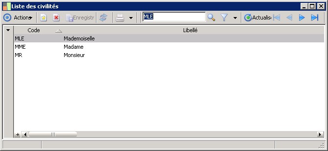 La liste des civilités apparaît en sélectionnant la fonction Paramètres / Société / Civilités .