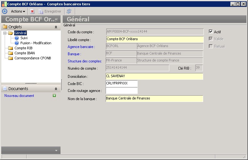 La clé RIB française permet de vérifier que le numéro de compte a été correctement saisi. Ce contrôle peut être désactivé dans la fiche agence bancaire. |