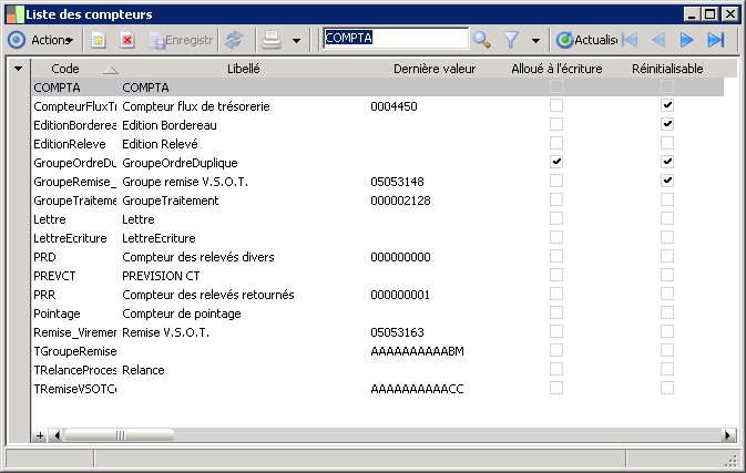 (Sage FRP 1000 Trésorerie) Menu Banque Paiement > Paramètres > Compteurs > Liste des compteurs