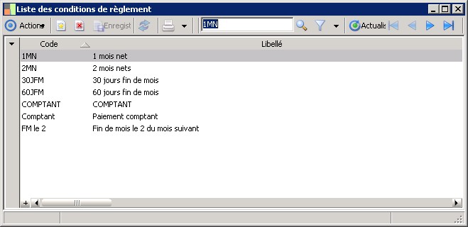 La liste des conditions de règlement s'ouvre à partir de la fonction Paramètres / Règlements / Conditions de règlement .