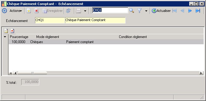 Le pourcentage permet d'éclater en une ou plusieurs échéances le règlement d'une facture.Un contrôle est effectué que le montant des pourcentages soit bien égal à 100%. |
