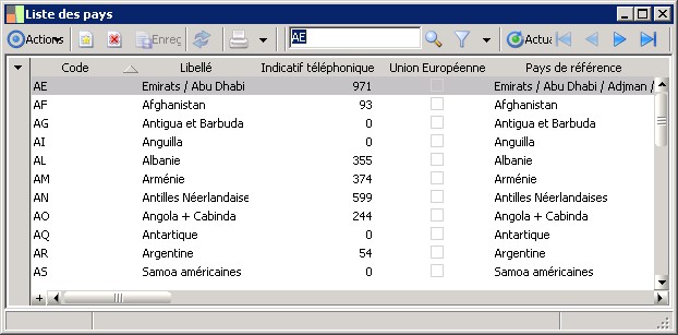 (Sage FRP 1000 Trésorerie) Menu Trésorerie > Paramètres > Généraux > Liste des pays