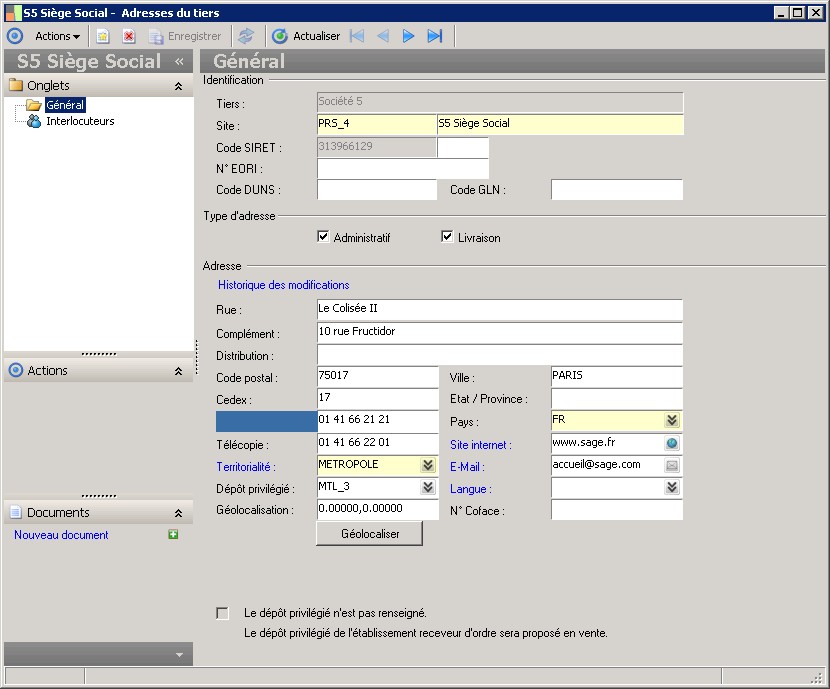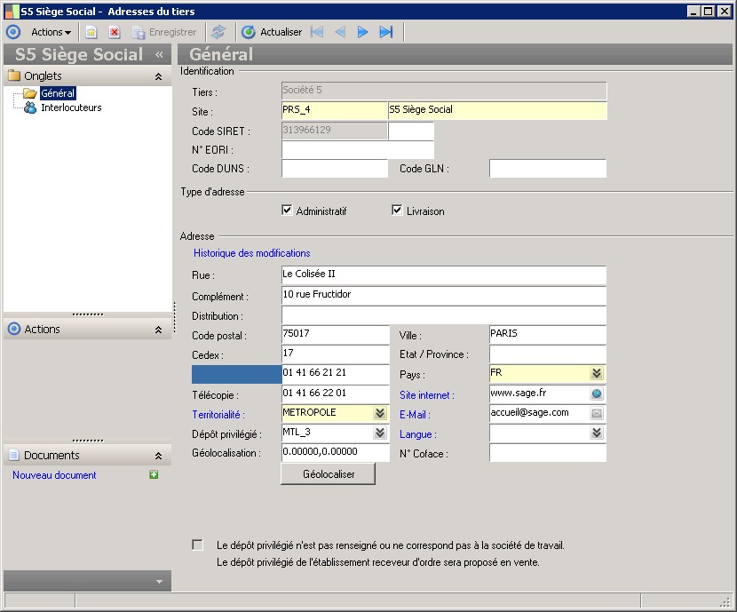 Le code permet d'identifier de manière unique un site.Au niveau de la fiche tiers, on peut gérer différents sites.Quand on attribue un rôle à un tiers, on indique le site privilégié du rôle tiers.