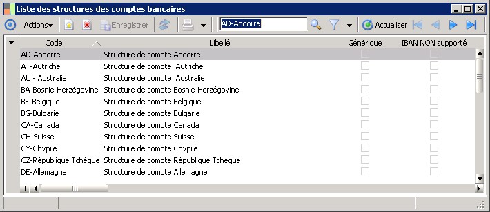 (Sage FRP 1000 Trésorerie) Menu Trésorerie > Paramètres > Banques > Liste des structures des comptes bancaires