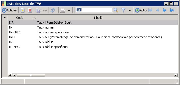Cette liste affiche les différents taux de TVA enregistrés. Le programme fait la distinction entre TVA et taxes qui doivent être paramétrées dans des fonctions différentes.